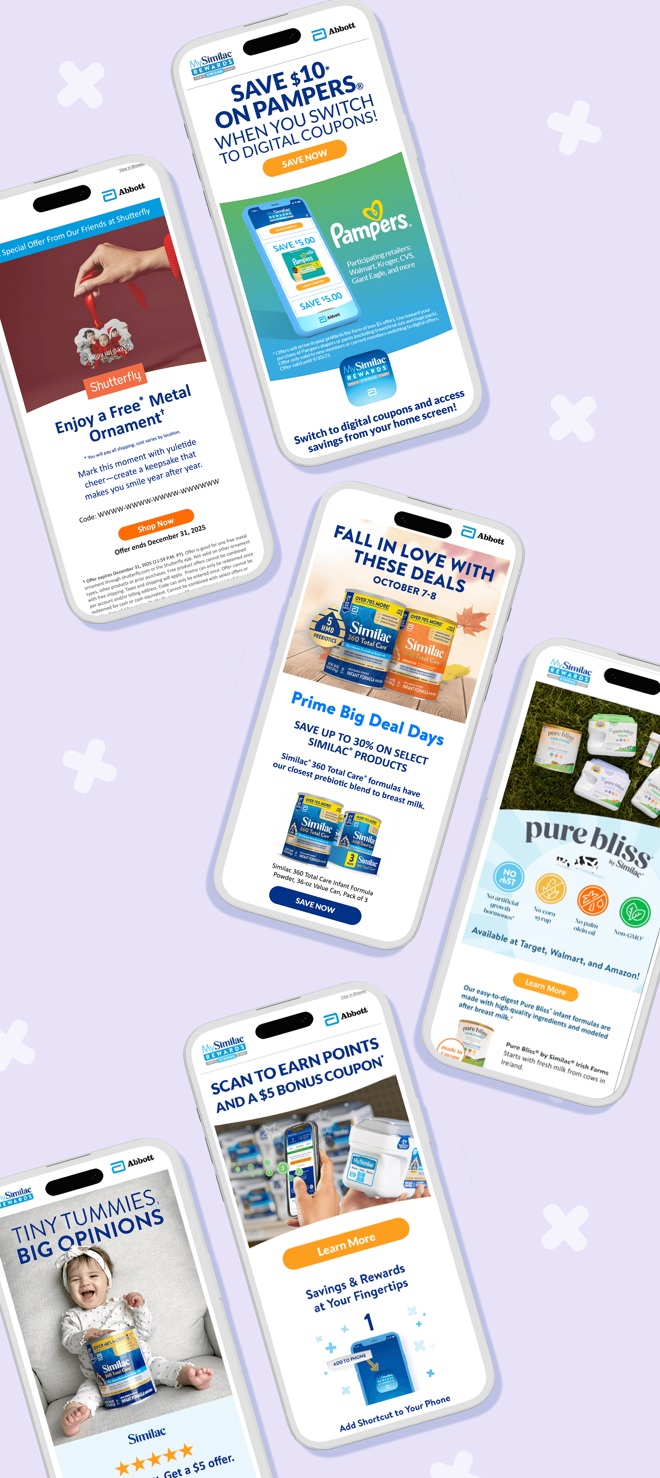 I was responsible for the design, maintenance, and technical production of the Similac CRM email program for registered Rewards users. This multi-segment program delivered monthly, personalized content based on the baby's date of birth and one of three formula segments (Standard, NeoSure/Premature, Hypoallergenic). Based on our delivery partner needing a modular system, I designed and maintained a comprehensive library of modular email components that dynamically assembled into full, segmented campaigns for the end user.